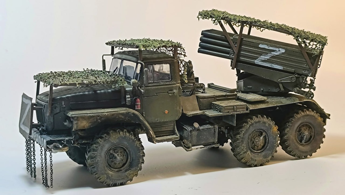 БМ-21 Град Koschcei Звезда, 1:35 От автора: "При сборки штатные колеса были заменены колесами шинами ОИ-25 Поздние от Kraft lab Создана анти-дроновые сетки из пластиковых профилей от ZipMaket и сеток от Микродизай. Передний щит из листовой меди и профилей ZipMaket. Так же было использовано фототравление от Микродизайн. На передний бампер «приварены» цепи с Али экспресса с звеном 2*1,5 Маскировочная сеть «барракуда» от MANWAH В работе была использована следующая химия: Грунтовка Mr.Hobby с родным разбавителем Краски от ammo mig , AK interactive, pacific, Vallejo Лаки от Mr.Hobby и ZipMaket Пигменты от Хася Моделист и ZipMaket Грязевые Жидкости от AK interactive" ================================