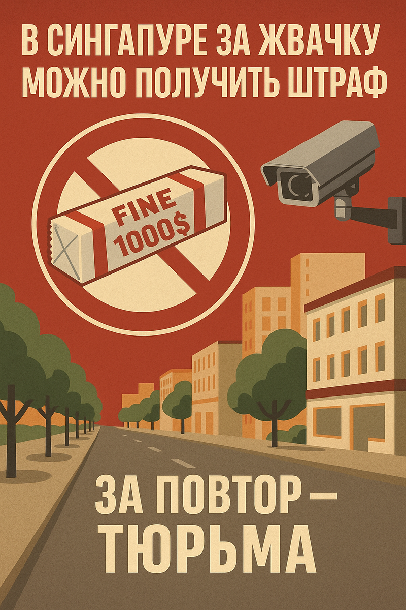 А за второй раз — общественные работы и уголовное дело. 📍 Добро пожаловать в Сингапур — страну, где жвачка считается угрозой общественному порядку. В 1992 году власти Сингапура запретили ввоз, продажу и жевание жевательной резинки.