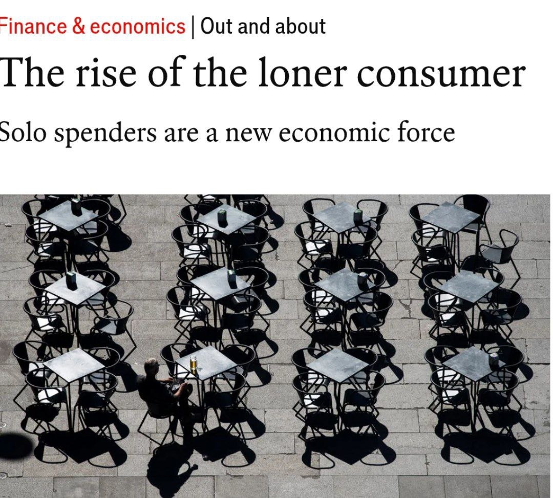 Однако наблюдаются значительные сдвиги в потребительском поведении. Например, тренд одинокого покупателя. Только за этот год на 80% выросло число туристов, путешествующих соло. Новая норма в ресторанах - один человек за столиком.