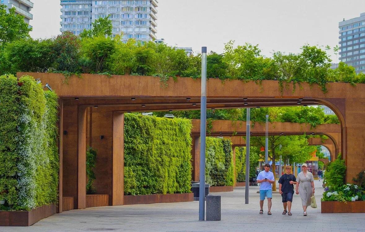 🌸 Новый Арбат в этом сезоне — это не только деловая магистраль, но и живописное прогулочное пространство, вписанное в ритм города. На нечетной стороне Нового Арбата раскинулся выразительный сад — двухуровневый зеленый тоннель с вертикальным озеленением, создающий цветущую прогулочную зону на протяжении всей улицы. На крыше тоннеля над головами прохожих растут фотинии, олеандры, бересклеты, нандины и бамбуки. Вдоль пешеходной зоны высажены розы, гортензии, многолетники и злаки, а зеленые стены из бело-зеленых ампельных растений (плектрантусов, плющей и белоснежных петуний) защищают от шума дороги и создают ощущение камерности и уюта. На четной стороне вас встречает лёгкий и воздушный сад, оформленный с использованием белоснежных конструкций каплевидной формы. Они создают многоуровневое пространство: внизу — пестрый ковер из многолетников, а на самых верхних уровнях «парят» в воздухе кроны бересклетов, кленов, яблонь и боярышников. 🌸 У здания Российской государственной библиотеки снова