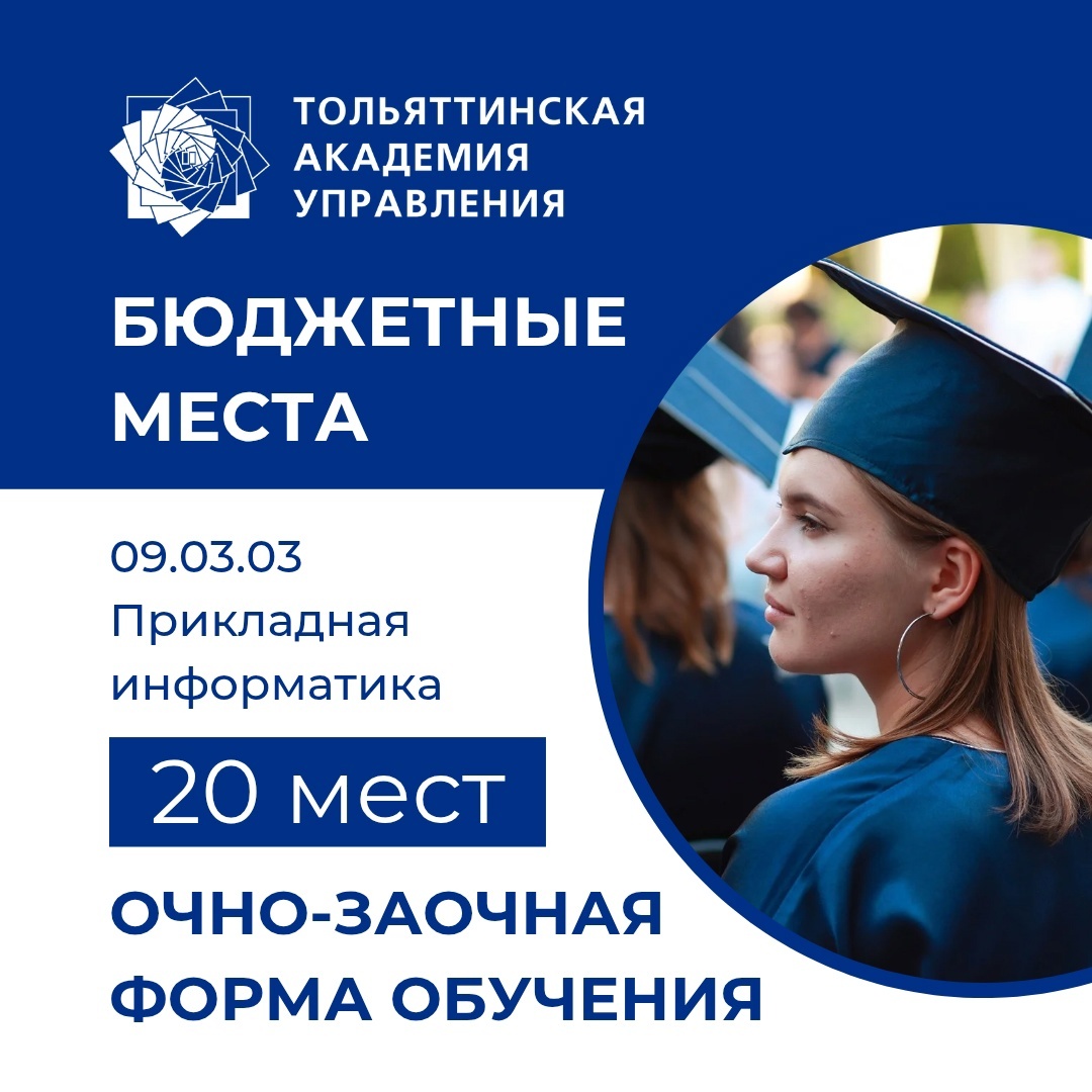 Вниманию выпускников колледжей и вузов! Тольяттинская академия управления (ТАУ) приглашает на бесплатное очно-заочное обучение по направлению подготовки «09.03.03 Прикладная информатика». Есть 20 бюджетных мест! Не упустите уникальную возможность стать студентом ТАУ и построить свою успешную карьеру в IT! Приемная кампания 2025 в самом разгаре! Прикладная информатика — одно из самых востребованных направлений деятельности в условиях стремительной цифровизации экономики. Вы получите знания и навыки, которые помогут вам внедрять инновационные IT-решения в деятельность реальных компаний. Вы можете выбрать один из двух профилей обучения: «Прикладная информатика в цифровой экономике» или «Дизайн и разработка цифровых программных продуктов». Постройте свою успешную карьеру в IT вместе с ТАУ! Подробная информация об условиях и правилах приема: по телефону +7 (8482) 555-044, эл. почте abitur.taom@gmail.com, на сайте Академии taom.academy/vuz/abitur, в группе во Вконтакте vk.com/taom_abitur. #Т
