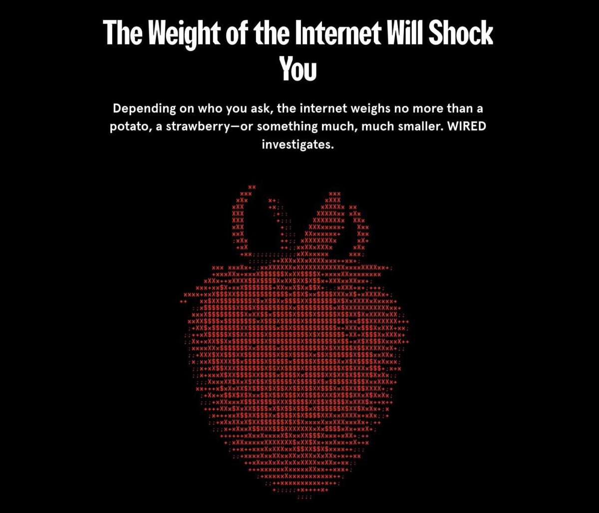 5,32 \* 10⁻¹⁴ грамма — именно столько, по подсчетам ученых, весит энергия, необходимая для шифрования всех мировых данных (175 зеттабайт) на одном сервере. Это примерно как вес одной молекулы пыли, только разделённой ещё на миллион. Интернет «весит» так мало, потому что это масса энергии, а не самих данных.