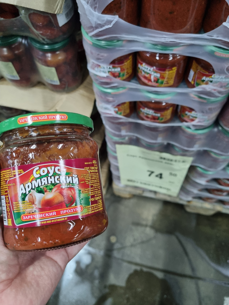 Будучи вчера в Светофоре, купил за 75 рублей вот такой соус: Я люблю томатные соусы и ногда беру на пробу. Впрочем, чаще всего они оказываются невкусными. В этот раз я не надеялся на то что это будет хорошо, просто соуса под названием "Армянский" ни разу не пробовал. Обычно как-то бллее стандартно - Краснодарский или Шашлычный. Итак, смотрим что за баночка: Производитель -Зареченский продукт, г Заречный Пензенская обл: На банке особо указано что продукт изготовлен из высококачественного сырья без использования крахмала и искусственных ароматизаторов. Это немного поднимает уровень ожиданий. В состав входят вода, томатнпя паста, сахар, соль, сушеные лук, чеснок, сельдерей, кориандр, уксус, перец "Чили" стручковый дробленый, перец черный молотый, перец красный молотый жгучий. Состав интересный. Видимо, будет что-то остренькое что довольро необычно для такого формата. Это очень неплохо и на вид и на вкус. Сладкий соус и при этом действительно острый. Немного похоже на лечо, только с перц