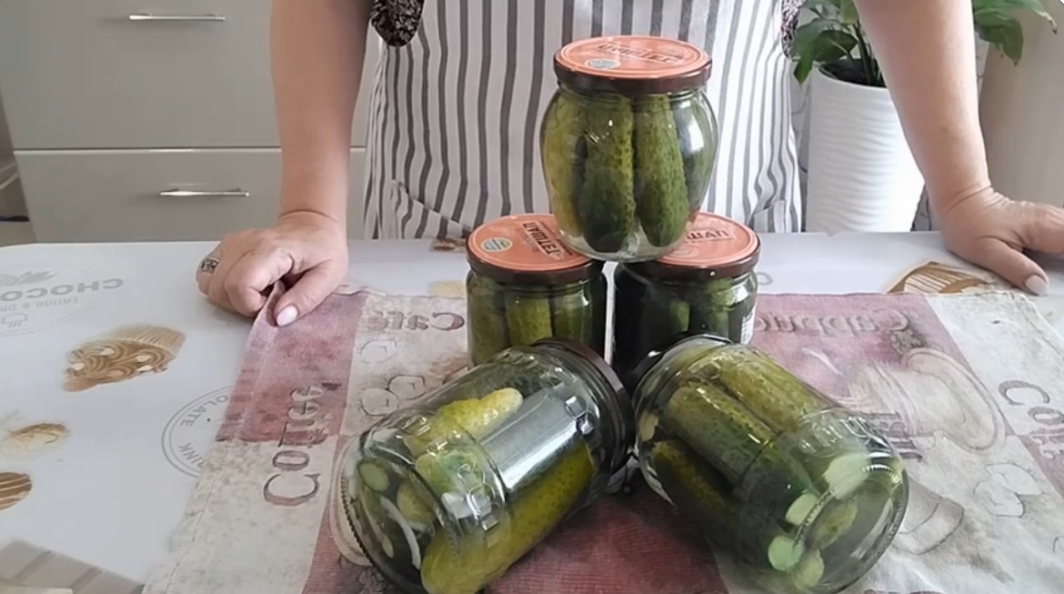 Рецепт хрустящих маринованных огурцов на зиму в литровой банке с уксусом без стерилизации.