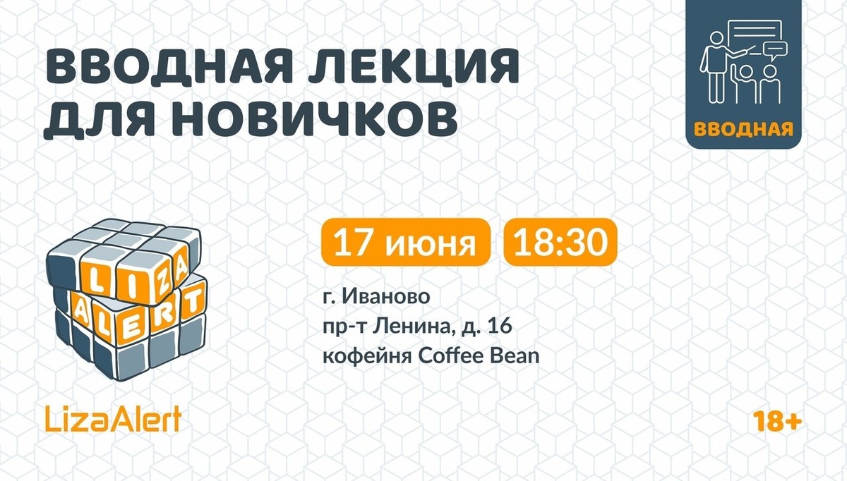 Ивановцев приглашают присоединиться к поисковому отряду «ЛизаАлерт» 17 июня в Иванове состоится вводная лекция «Новичковой» от поискового отряда «ЛизаАлерт». Гости встречи узнают, кто такие «ЛизаАлерт», как и с чего началась история отряда, а также - как начать помогать и спасать жизни людей. Важно – на встрече ждут ивановцев старше 18 лет. Мероприятие состоится в 18:30 в кофейне Coffee Bean по адресу пр. Ленина, д. 16. Зарегистрироваться можно в группе отряда в ВКонтакте.