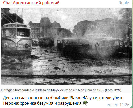 70 лет назад: бомбардировка Пласы де Майо (аналог Красной площади в Москве) и попытка убийства Перона 📅 16 июня 1955 года — один из самых трагичных дней в истории Аргентины. В этот день вооружённые силы страны, поддерживаемые оппозиционными политическими и гражданскими группами, совершили воздушную атаку на Плазу де Майо в Буэнос-Айресе с целью свержения президента Хуана Доминго Перона и его правительства 💥 Ход событий: Начало атаки: В 12:40 дня 34 военных самолёта, включая AT-6 и Beechcraft AT-11, начали бомбардировку центральной части города, включая Пласу де Майо, Дом правительства (Каса Росада), Министерство обороны и другие ключевые объекты. Цели: Основной целью было уничтожение президента Перона и его кабинета. Однако Перон, получивший предупреждение, успел покинуть Каса Росада и укрыться в МинОбороны, расположенном в 200 метрах от места атаки Жертвы: В результате бомбардировки погибли более 300 человек, включая как военных, так и гражданских лиц. Более 800 человек получили р