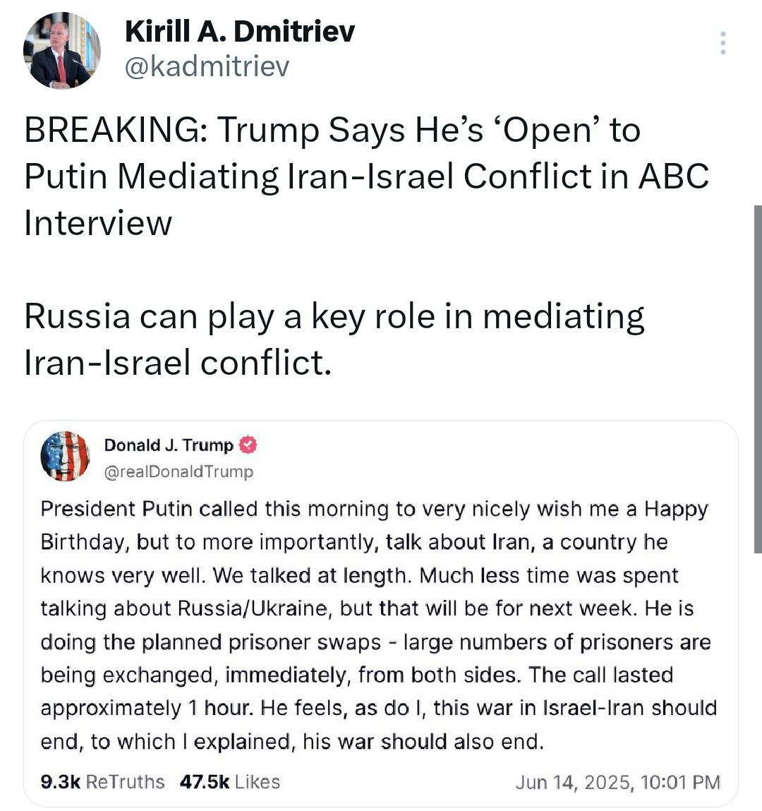 Putin's envoy @kadmitriev says Russia 'can play KEY role in mediating Iran-Israel conflict'