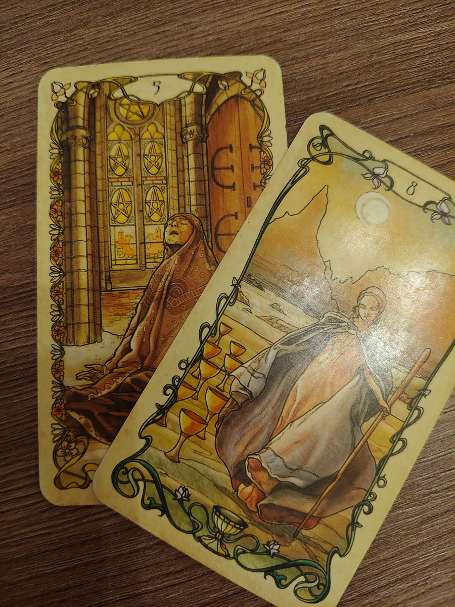 Пятёрка Пентаклей и Восьмёрка Кубков – сочетание, которое говорит о периоде потерь и необходимости двигаться дальше, оставляя позади то, что больше не приносит удовлетворения. Пятёрка Пентаклей символизирует нужду, одиночество и материальные трудности. Человек может ощущать себя отвергнутым, испытывать финансовые затруднения или чувствовать себя изолированным от общества. Важно помнить, что это состояние временное, и возможности для улучшения ситуации есть. Восьмёрка Кубков, напротив, призывает к переменам. Карта указывает на необходимость оставить позади привычное, но уже не приносящее радости. Это может быть работа, отношения или даже убеждения. Важно признать, что прошлое осталось в прошлом, и двигаться к новым горизонтам. Вместе эти карты говорят о том, что человек переживает сложный период, возможно, связанный с финансовыми или эмоциональными потерями. Однако, Восьмёрка Кубков призывает не зацикливаться на негативном опыте, а искать новые возможности и двигаться вперёд. Отпустит