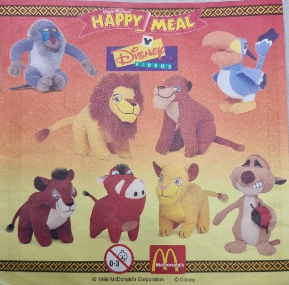 В серии The Lion King 1998 из McDonald's представлены персонажи одноименного диснеевского мультфильма. Тут мы видим 8 плюшевых игрушек: 1. Кову (сын Зиры) 2. Зазу (птица) 3. Тимон (сурикат) 4. Киара (дочь Симбы) 5. Симба 6. Рафики (бабуин) 7. Зира 8. Пумба (кабан) В моей коллекции есть следующие игрушки: Другие серии из McDonald's посвящённые The Lion King: - The Lion King 1994 - The Lion King 2004 Если интересуют другие игрушки из McDonald's , то переходим на Главную страницу