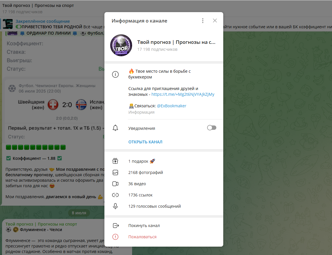Бесплатные прогнозы зачастую имеют маленькие коэффициенты, на которых хорошо заработать не удастся. Сигналы на экспресс-ставки приводят к сливу депозитов, поскольку мошенник призывает вкладываться по максимуму. Мы не рекомендуем данный телеграм-канал как средство заработка, исключительно просмотр в развлекательном характере.
