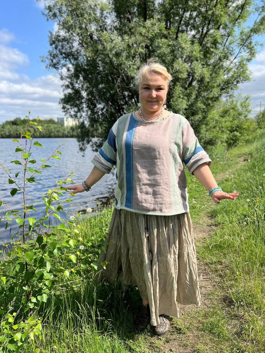 Все вышедшие в "тираж" льняные мои штаны ушли в дело. Финальная история - блуза, сшитая из полос остаточных. О технологии шитья и рассказывать нечего: резала на полосы и сшивала их меж собой. Кофейного льна от дольше всего прослуживших брюк было больше, так что и полоса - шире. В ход, конечно, пошли и фрагменты имеющегося в наличии нового хлопка и кружев. По каждому практически шву прошлась декоративной строчкой нитками в той же цветовой гамме, что и сам блузон. Вот и вся история))