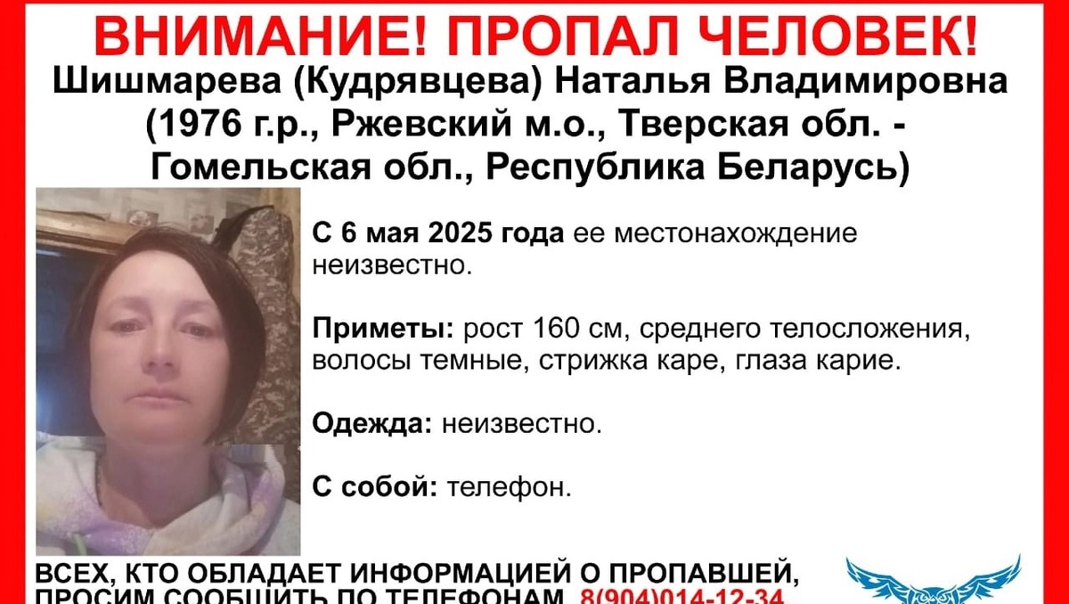 В Тверской области пропала 49-летняя жительница Ржевского округа Тверской области 49-летняя Наталья Владимировна Шишмарева (Кудрявцева). С 6 мая 2025 года ее местонахождение неизвестно, сообщает тверской волонтерский поисково-спасательный отряд "Сова".