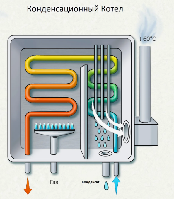 В обычном газовом котле продукты сгорания проходят через теплообменные поверхности котла, где отдают свою энергию теплоносителю. При этом некоторое количество теплоты теряется, в том числе потому что вместе с газами уходит водяной пар, образовавшийся при сгорании топлива из воды, находящейся в природном газе в нормальном состоянии. Этот пар уносит с собой скрытую энергию парообразования, которую споособен отобрать и передать системе отопления конденсационный котел.