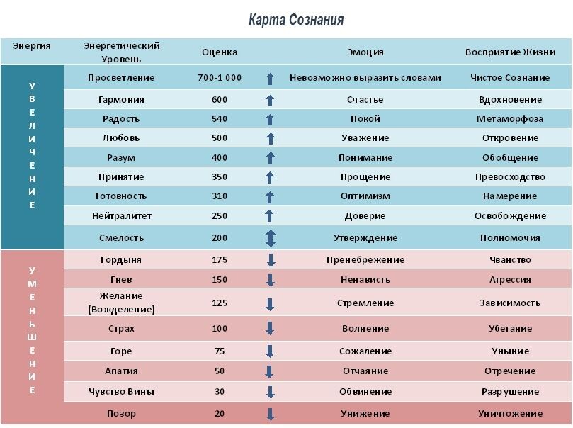 Говоря о страхе, сразу вспоминается «карта сознания» Дэвида Хокинса - шкалы, где каждая эмоция соответствует определённой вибрации. Кто не знает или забыл, предоставляю таблицу: