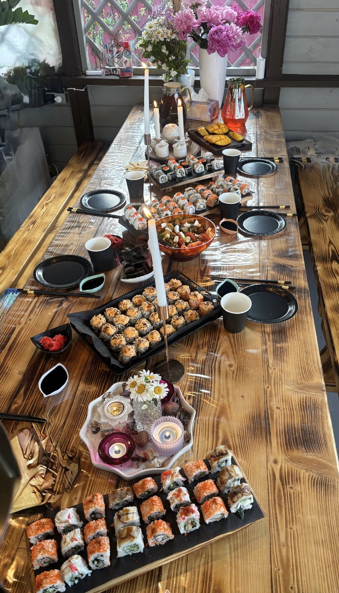 Накрутила роллы на праздничный ужин на 10 человек. 6 взрослых 4 ребенка. 5 шт -Калифорния 5 шт в кунжуте( часть запекла) 4 шт с угрем 3 шт в снежном крабе 5 шт с огурцом. Итого 22 колбасы и 176 кусочков. На фото чуть больше 100 шт, остальное на детском столе. 4 часа времени и все готово🎉! Я в отпуске и могу себе позволить 😂. Помимо роллов был салат с баклажанами, все наелись и даже осталось немного. Список продуктов и себестоимость такого ужина :