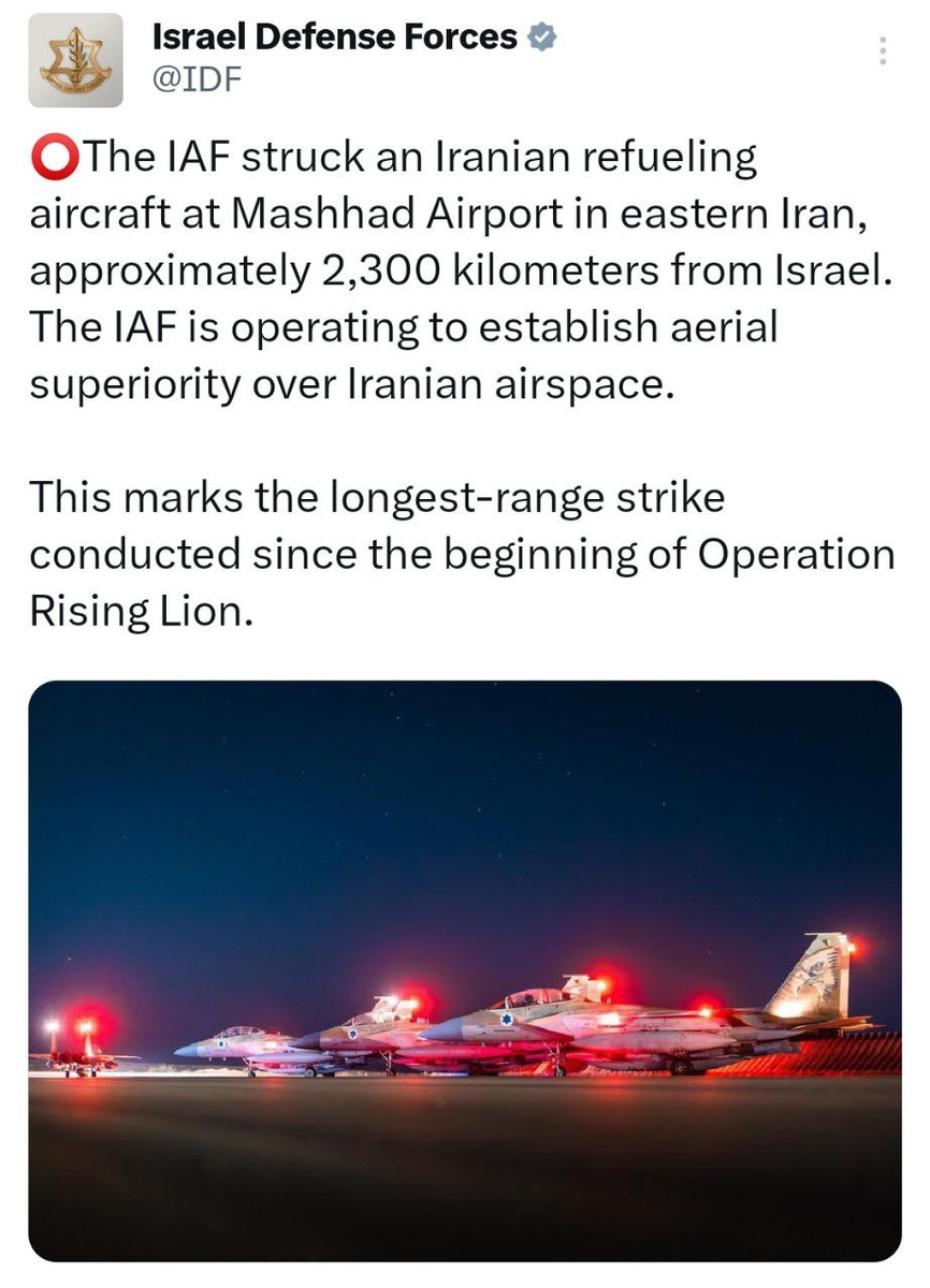 В ответ на пост IDF says Mashhad attack 'longest-range strike' since start of op 2,300 KM from Israel Adds Israel working to 'establish aerial superiority over Iranian airspace'
