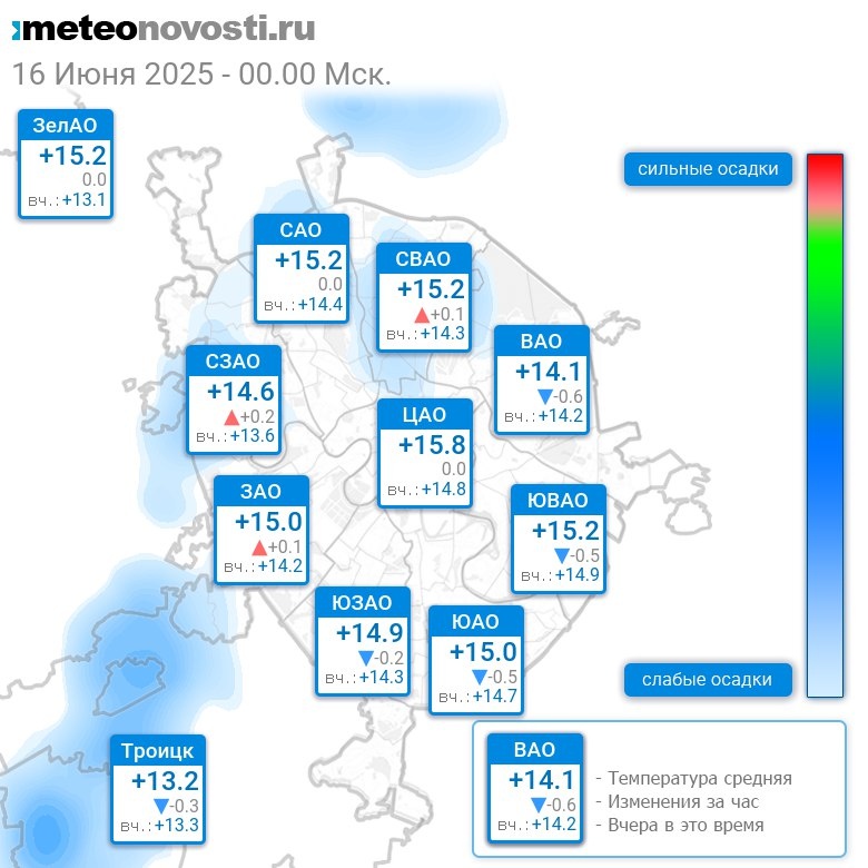 В 0:00 в Москве было от +13.3°C до +16°C, средняя температура +15°C #погода #Москва #лето #температура #16июня #понедельник
