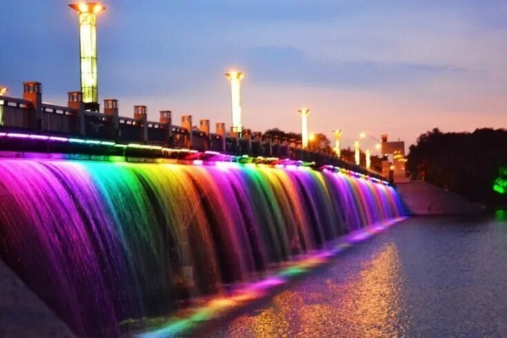 Мост-фонтан в Сеуле Длина моста — 1140 метров, он перекинут через реку Ханган и соединяет районы Сеула Сочо и Ёнсан Мост был возведён в 1982 году. В 2007 году муниципалитетом Сеула было принято решение сделать речную зону туристическим объектом и местом для развлечений и прогулок: реконструкция моста стала частью проекта «Возрождение Хангана». Фонтан запустили в эксплуатацию в мае 2009 года. Днём струи принимают причудливые очертания и демонстрируют различные фигуры. Вечером, когда включается цветная RGB-подсветка, фонтан превращается в шоу с танцующей водой, которое сопровождается музыкой. Для подсветки использованы все цвета радуги, имеющие для корейцев символическое значение Данный мост занесен в книгу рекордов Гинесса, так как он является самым длинным фонтаном в мире , длина моста составляет 1140 метров