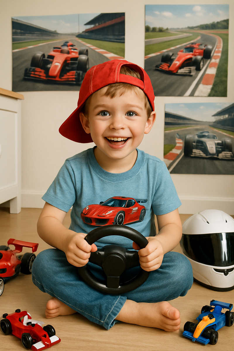 — Скажите, а можно нарисовать картину… такую, как будто он уже чемпион? — с робкой улыбкой спросила мама. — Чемпион? — уточнили мы. — Да. Только не "в будущем", а прямо сейчас. Он каждый день устраивает гонки в своей комнате, объявляет старт в игрушечный микрофон и кричит: "Я — Макс, я номер один!" Мы подумали: пусть это станет настоящей историей. Как будто он действительно — на трассе, под салютом, а не просто сидит на полу с рулём. 📸 На фото — мальчик лет четырёх, с глазами, полными света, и улыбкой, от которой гонки начинают казаться не игрой, а призванием. На нём футболка с машинкой, кепка — наоборот, руль — всерьёз. Вокруг игрушечные болиды и плакаты трасс. Комната — как пит-стоп перед большой мечтой. 👩👦 — Он всё время говорит, что когда вырастет, построит "машину, которая будет быстрее молнии". А пока тренируется. Даже засыпает с рулём в руках. Я подумала: пусть будет картина. Чтобы у него всегда была сцена, где он — герой. 🎨 На картине: