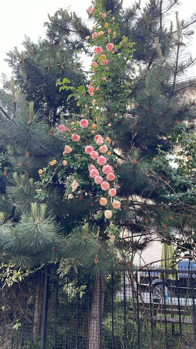 Помните "как бы мне рябине к дубу перебраться? " А эта роза перебралась к сосне