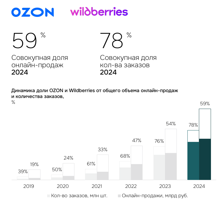 Количество онлайн заказов Wildberries+Ozon от всех онлайн заказов в РФ, согласно исследованию IBC Real Estate, c 2019 по 24 года выросло с 39 до 78%. Если добавить к этому крупных игроков, вроде Яндекс Маркет, то окажется, что уже близко к 90% всех заказов онлайн проходит через маркетплейсы.