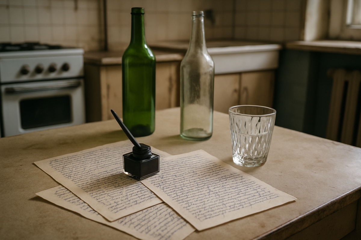 Первые лучи утреннего солнца застали его спящим на кухонном столе, с улыбкой от осознания, что он смог, в окружении пустых бутылок и мятых черновиков. Отдельно от ночного хаоса гордо лежал лист с чистовиком стихотворения.