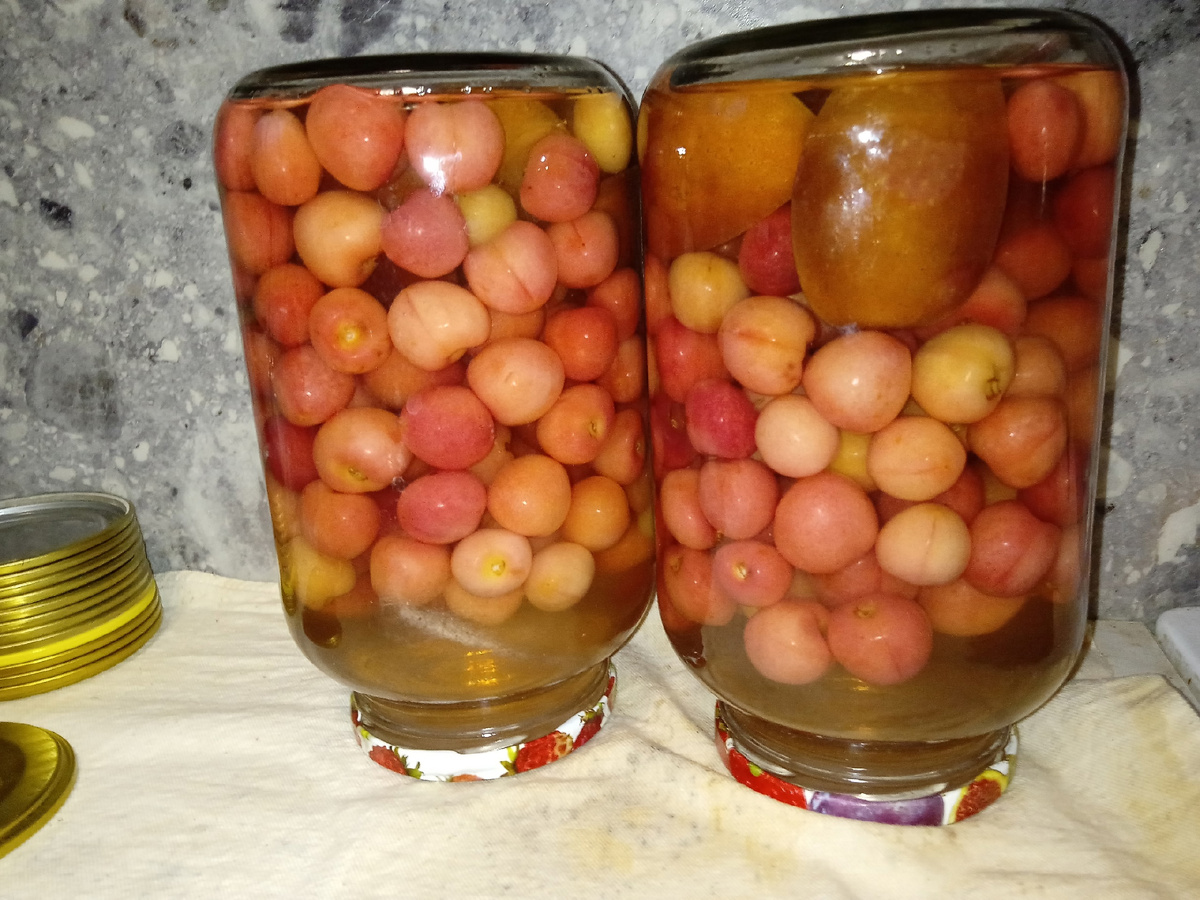 Для приготовление этой простой заготовки на зиму вам понадобится: черешня - 1 кг., яблоки - 4 шт., сахар - 2 стакана, банки 1,5 литра - 2 шт., крышки - 2шт. Обычно мы съедаем созревшую черешню, но в этом году ветер сломал ветку с еще не совсем спелой ягодой, поэтому сделала из нее компот на зиму. Ягоду помыть, яблоки почистить и разрезать на 4 части. Подготовить банки и крышки. Банки стерилизовать удобным для вас способом. Для стерилизации банок я сначала их мою с содой, затем кипячу в кастрюльке с водой так, чтобы горлышко банки было в воде. В время стерилизации не засекаю, банки готовы, если рука не терпит их температуру. В другой кастрюле кипячу воду. В горячую банку сложить яблоки и черешню, залить кипятком, накрыть крышкой и оставить на 10 минут. Через 10 минут воду слить в кастрюлю, добавить сахар. Закипятить сироп и, в другой кастрюльке крышки. Залить ягоду кипящим сиропом, крышки закатать. Банки перевернуть на крышку и оставить на пару дней. Хранить компот в подвале. Надеюсь,