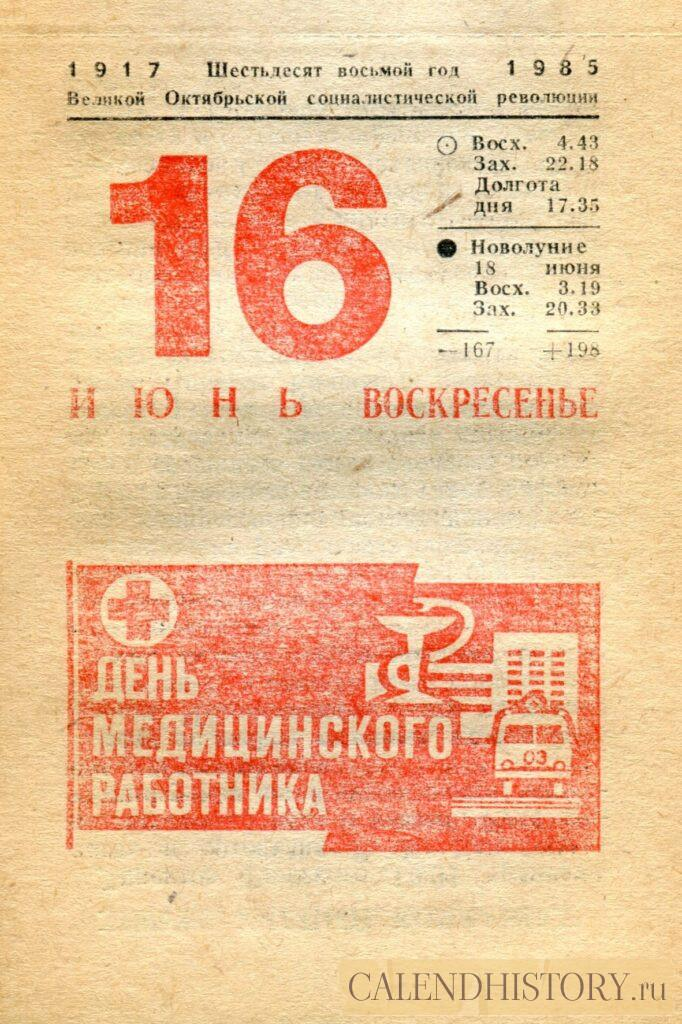 Итак, сегодня 16-го июня и у нас на календаре 1985-й год. Перед нами листок советского календаря для женщин. На календаре у нас воскресенье - 16 июня 1985-го года. ДЕНЬ МЕДИЦИНСКОГО РАБОТНИКА *** Оборотную сторону листка этого календаря можно посмотреть у нас по ссылке на сайте. Другие листки советских календарей смотрите у нас на сайте - CALENDHISTORY.ru ПОСМОТРИТЕ ЕЩЁ ЛИСТКИ ОТРЫВНЫХ КАЛЕНДАРЕЙ: