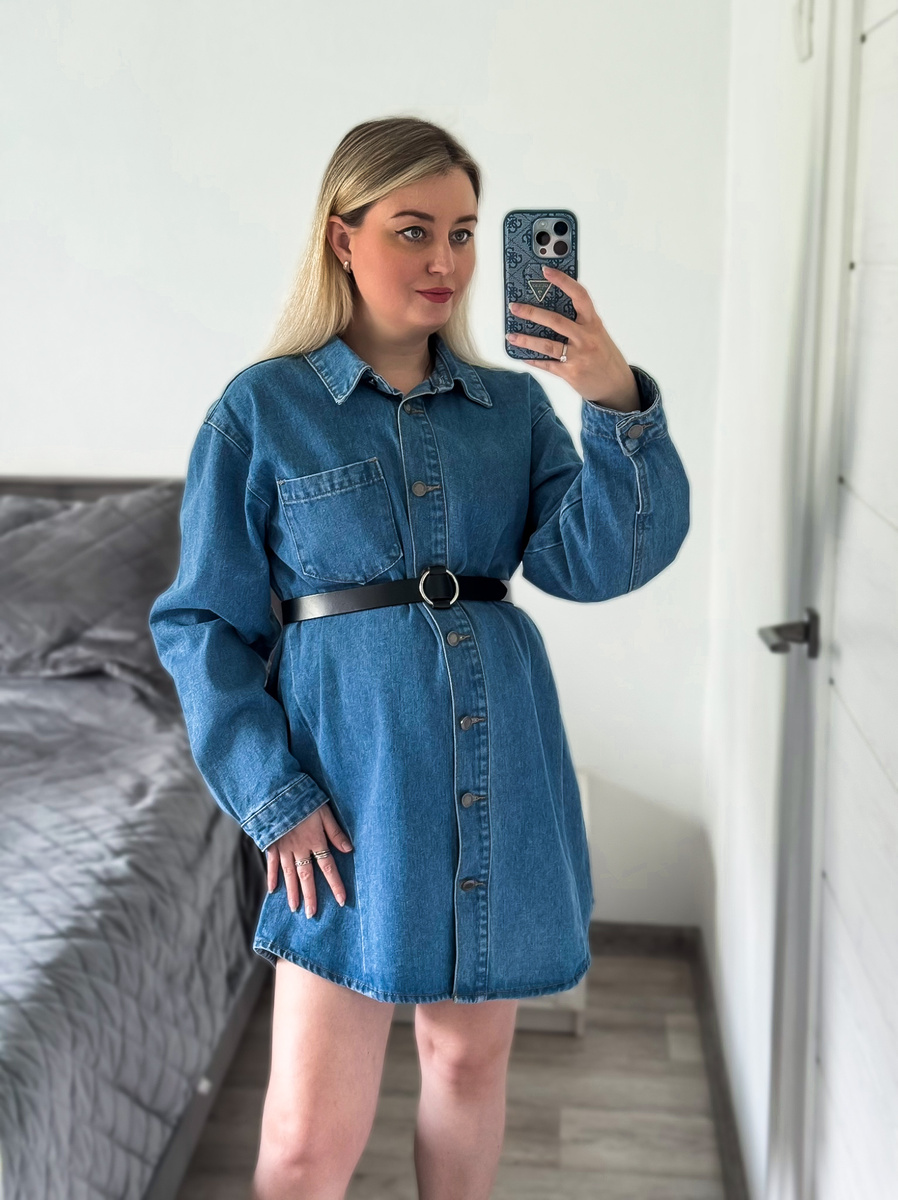 Красивое, стильное платье из джинсового материала. Долго смотрела на него на Wildberries, решила заказать и ни разу не пожалела! Платье выполнено из плотной, качественной джинсы. Можно носить его и как куртку поверх летней одежды, но мне больше нравится вариант платья. Фасон оверсайз, сидит свободно, подходит в том числе и беременным на любом сроке. Ремень я добавила свой. В комплекте он не идёт. Люблю, когда талия подчёркнута. Заказывала привычный размер 44, подошло идеально. Рукава немного длинноваты при росте 165 см, но не критично. Прямая ссылка на товар на Wildberries тут.