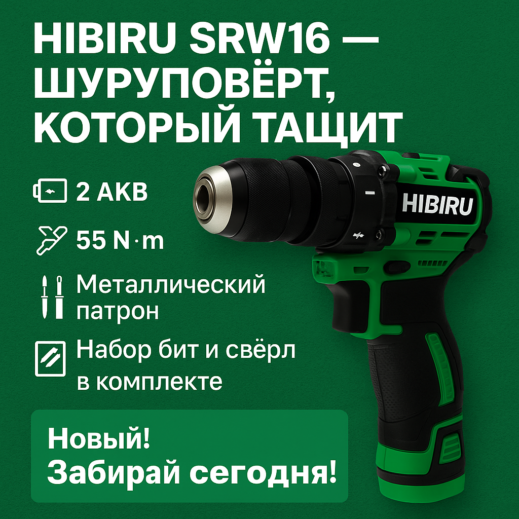 Всем привет, друзья! Меня зовут Макс, и я обычный мужик, который просто хотел прикрутить полку. Ну, ту самую, которую жена просит повесить уже полтора года. А я — как вы понимаете — весь в делах: то диван тестирую, то на кухне кофе настраиваю. Но в один момент настал тот день — когда ты понимаешь: пора. Полка не повесит себя сама. А старый дребезжащий шуруповёрт из "ещё того гаража" — не компаньон, а пародия на инструмент. Так началась моя эпопея с выбором — и покупкой HiBIRU SRW16, героя сегодняшнего обзора. Китайский бренд, про который ещё пару лет назад никто не знал, внезапно стал любимцем маркетплейсов. Цена до 6000 рублей, обещания — как у профи-инструмента: бесщёточный мотор, два аккумулятора, металлический патрон, 55 Н·м крутящего момента. Подозрительно, правда? Но мы тут не «верим — не верим». Мы тестим, крутим, сверлим и потом делимся честным мнением. Смотрим, что внутри: 1. Бесщёточный мотор — не сгорит через два месяца, как у ноунеймов