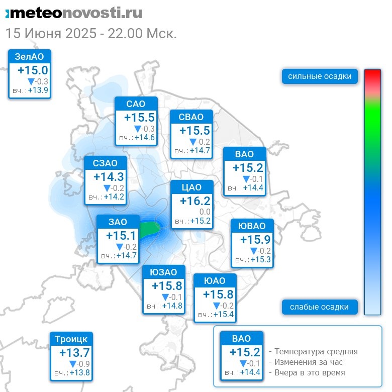 В 22:00 в Москве было от +13.6°C до +16.6°C, средняя температура +15.3°C #погода #Москва #лето #температура #15июня #воскресенье