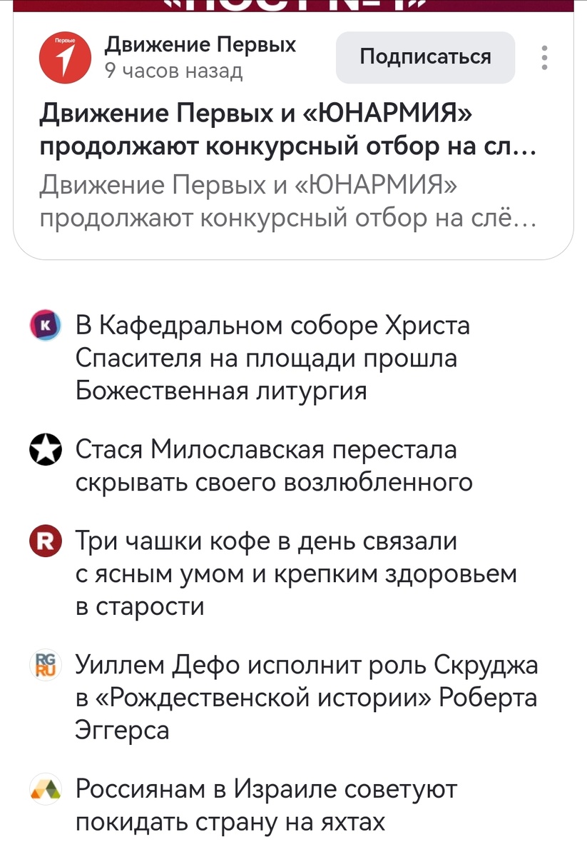 Вы себя ощущаете иногда никчемышем, который непонятно из какого леса вышел, ничего не видел и ничего не знает? Из меня пытаются периодически сделать такого человека. Вернее, делают все для того, чтобы я себя им почувствовала. Возможно, кто-то скажет, что скрин как скрин ниже, ничего особенного, а мне здесь от первой до последней буквы все говорит о том, что я в этой жизни плохо стала понимать происходящее. Много раз писала о том, что так получилось, что нас учили понемногу и всему помимо основных дисциплин. В том числе учили и правильно расставлять приоритеты в новостях для газетных передовиц. Да, нужно было уметь заинтересовать, но без хайпа и топтания на костях. В новостях советского периода ВСЕГДА присутствовала мораль, поэтому мне и бросаются глаза подобные "казусы" Вообще любопытный ИИ у Дзена. Это ж в каком количестве должны присутствовать завихрения в сером веществе, чтобы после блога "Движение Первых" выдать на горА новость про Божественную литургию. А сразу за ней новость пр