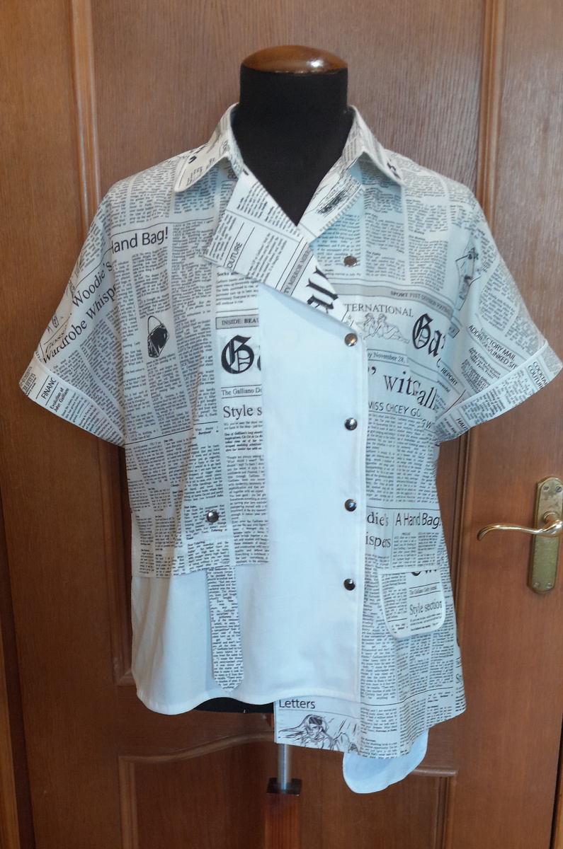 Здравствуйте! Я Владимир Садыков, представляю обзор созданной мной блузки "Авангард". Блузка комбинированная, выполнена из двух видов ткани, это стопроцентный хлопок белый и на белом фоне газетный принт. Асимметричная застёжка на кнопках (верхняя кнопка декоративная) и короткие цельнокроеные рукава. На правой полочке имитированная отлётная кокетка из под которой свободно висит хлястик. Лацканы так же асимметричны, правый шире, левый уже. Воротник выполнен на стойке. Нижний воротник, изнанка клапана, а также изнанка отворота рукавов выполнены из белой ткани, и все эти детали отделаны белым кантом. а также изнанка отворота рукавов выполнены из белой ткани, и все эти детали отделаны белым кантом. На спинке встречная складка зашитая на уровне лопаток. При желании воротник можно поднять наполовину отлёта, или полностью Функциональный карман, прорезной в рамку с клапаном и выглядывающая мешковина из под полочки. Так выглядит карман с изнанки. Подборта широкие, внутренние срезы обмётаны, з