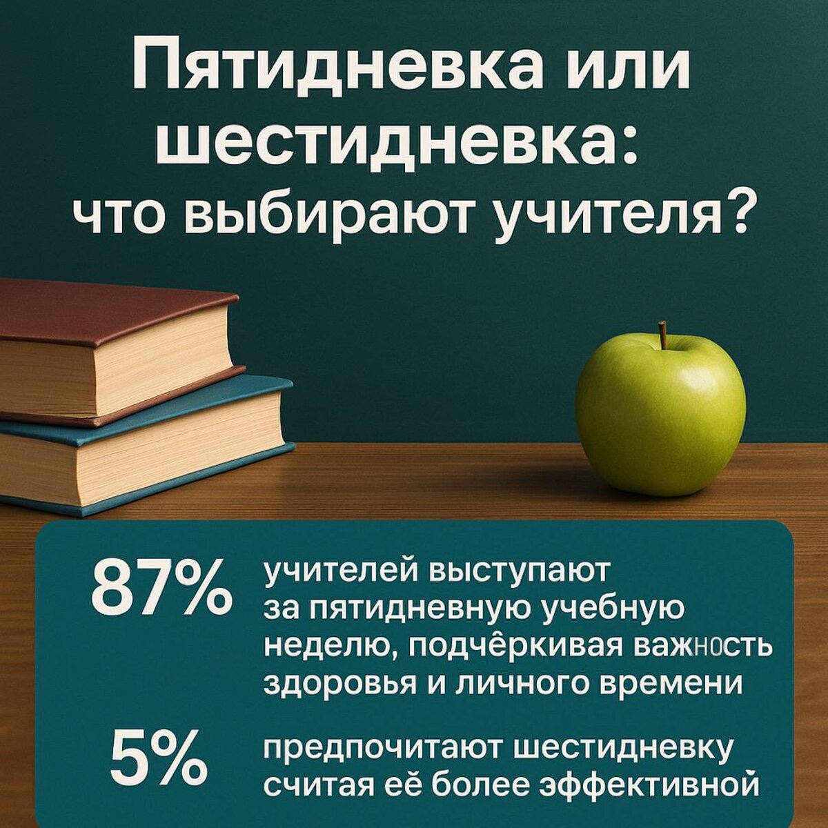 Пятидневка или шестидневка: что выбирают учителя? ❗️Переход школ на пятидневную учебную неделю стал одним из самых обсуждаемых вопросов в российской образовательной среде. ➡️Исследование, проведённое Федеральной инновационной площадкой Минобрнауки России «Единыйурок.рф», дало повод серьёзно задуматься о необходимости изменений в организации труда педагогов. ✅Более 1200 учителей из 40 регионов приняли участие в опросе, который показал: 🔸87% педагогов выступают за пятидневную рабочую неделю, 🔸только 5% готовы продолжать работать по субботам. ➡️Такой почти единогласный выбор говорит не просто о предпочтениях, а о накопившейся системной усталости, выгорании и стремлении учителей к более сбалансированному образу жизни. ➡️Среди основных причин отказа от шестидневки педагоги называют хроническую усталость, ухудшение здоровья, отсутствие личного времени и падение мотивации. Показательно, что даже в сельской местности и среди ветеранов педагогического труда поддержка пятидневки достигает