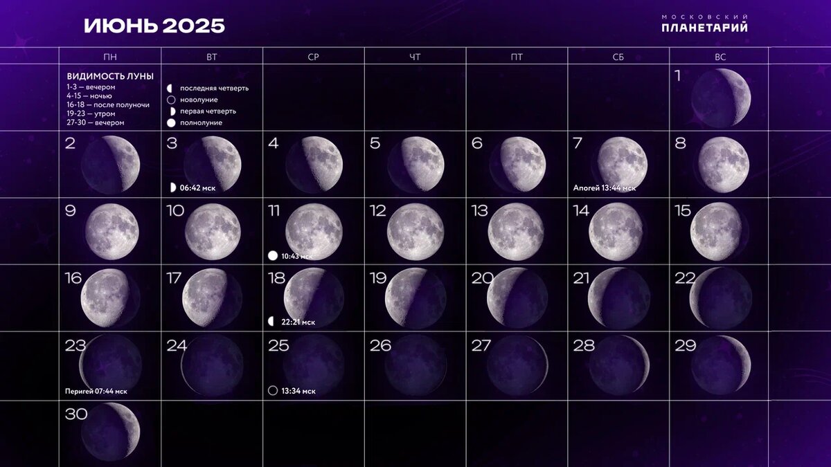 03 июня (06:42 мск) – первая четверть 07 июня 13:44– Луна в апогее своей орбиты на расстоянии 405551 км от Земли 11 июня (10:43 мск) – полнолуние 18 июня (22:21 мск) – последняя четверть 23 июня 07:44– Луна в перигее своей орбиты на расстоянии 363176 км от Земли 25 июня (13:34 мск) – новолуние 1-3 – вечером 4-15 – ночью 16-18 – после полуночи 19-23 – утром 27-30 – вечером Читать полный текст статьи — clck.ru/3MEpyH