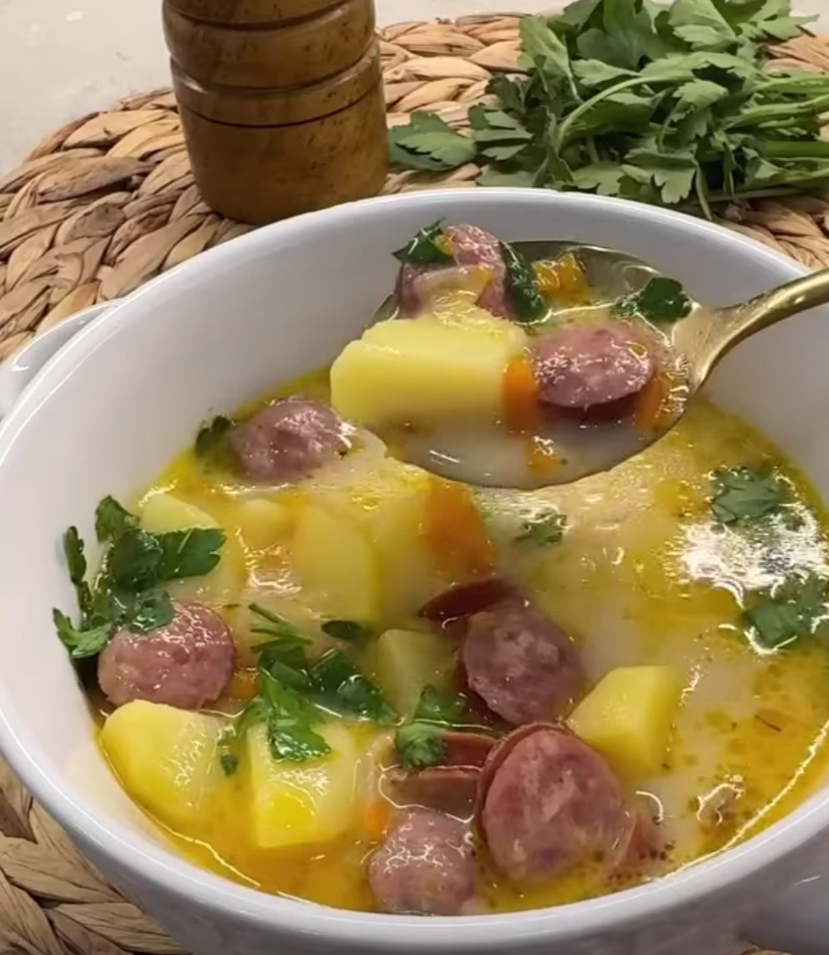 **Ингредиенты:* **Приготовление:** 1. В кастрюле на сливочном масле обжарьте лук с морковью. 2. Добавьте колбаски и жарьте 4 минуты. 3. Положите в кастрюлю картофель, специи и лавровый лист. 4. Залейте кипятком и варите 10–15 минут до мягкости картофеля. 5. Добавьте плавленый сыр, перемешайте, доведите до кипения и снимите с огня. Подавайте с рубленой зеленью. Приятного аппетита!♥️