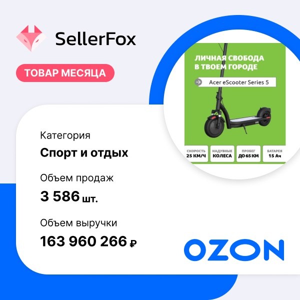 Катим на повышение. Электросамокат бренда Acer стал лидером по объему выручки на Ozon в категории "Спорт и отдых". За последние 30 дней товар приобрели более 3,5 тысяч раз на сумму свыше 163 млн рублей. Средняя цена продажи товара - около 40 тысяч рублей. Напомним, с 13 июня 2025 года на Ozon для большинства категорий на FBS тариф на продажу станет выше на 3–4,5%, на FBO — на 4,5%, для fashion-товаров на FBO и для большинства категорий на realFBS — в среднем на 5%.