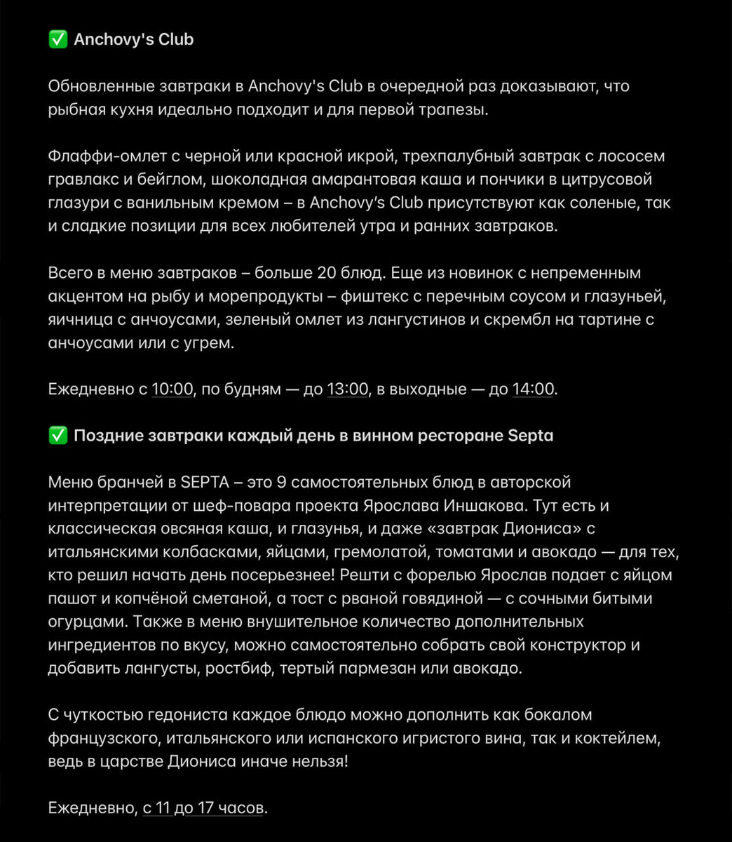 👤 РестоБонус ©Анастасия Морозова Летом хочется рано вставать и гулять-гулять! А кто же гуляет на голодный желудок?! Правильно — это не правильно! Поэтому предлагаю начать утро со вкусных и нетривиальных завтраков! Делюсь интересными местечками и предложениями. ✅ «Чарли» bistro&champagne В числе новинок утреннего меню – конструктор, так что каждый может собрать свой идеальный завтрак. К авокадо тосту, картофельным драникам, пшеничным блинам, классическому омлету, скрэмблу или глазуньи в “Чарли” на выбор предлагают заказать: черную икру, лосось, грюйер, краба, обжаренные на гриле креветки, томаты и многое другое. Также есть комбо-завтрак, если с утра не хочется выбирать, то бренд-шеф Никита Рендино собрал на свой вкус французский завтрак: яйцо 5-минутка, слайсы грюйера, мортаделла, авокадо, свежий тартин, крем из горгонзолы и апельсиновое масло. Останется только решить, что добавить: красную или черную икру. Цена: с красной икрой — 1.100₽, с черной икрой — 1.600₽. *с 10:00 до 14:00