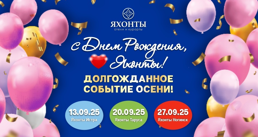 Осень только начинается, а у нас уже запланировано главное событие сезона — День Рождения сети отелей ЯХОНТЫ! Нам есть что отпраздновать, и мы приглашаем вас отметить это событие вместе! В сентябре три курорта сети превращаются в праздничные островки радости: ЯХОНТЫ НОГИНСК, ЯХОНТЫ ИСТРА и ЯХОНТЫ ТАРУСА. Готовьтесь к настоящему фейерверку эмоций! Вас ждёт: И, конечно, не обойдётся без наших фирменных угощений, тематического декора и уютной атмосферы, которую можно найти только в ЯХОНТАХ. Забронировать номер можно: 1. Позвонив по тел. 8 (800) 500-47-09