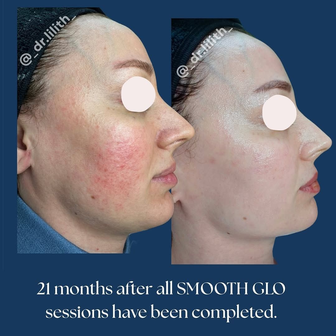 В ходе одной процедуры SmoothGlo выполняется IPL-терапия с целью селективного разрушения патологических сосудов кожи и устранения пигментации, а также воздействие микроиглами RF с целью обновления дермального матрикса, лифтинга и выравнивания морщин.