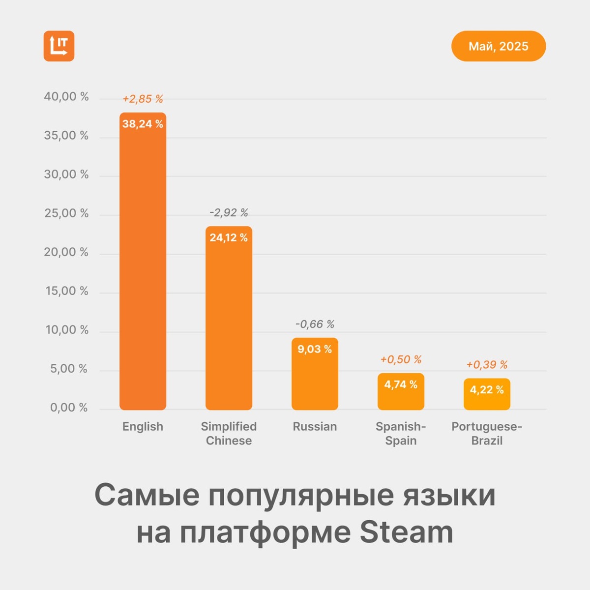 ✏️ Мы подготовили свежую статистику самых популярных языков на платформе Steam на основе данных за май 2025 года.