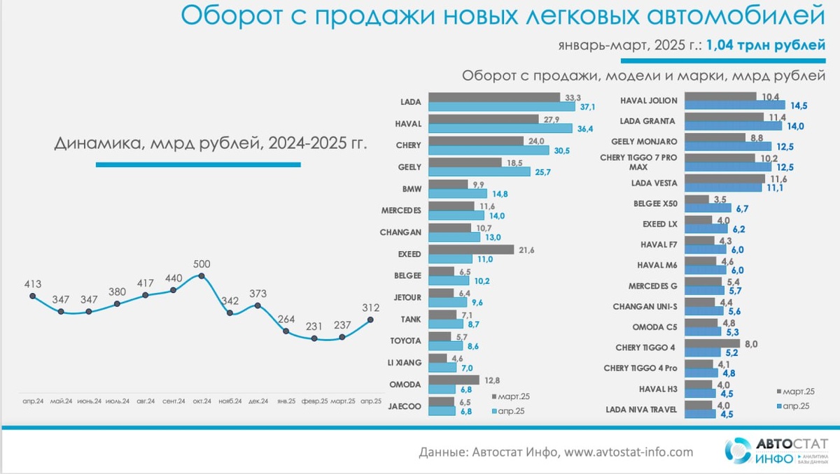 По данным статистики «Автостат Инфо», за первые четыре месяца 2025 года российские покупатели потратили на новые легковые автомобили сумму в 1,04 трлн рублей. При это обороты на авторынке в апреле достигли 312 млрд рублей, что заметно больше, чем показатели, зафиксированные в предыдущие месяцы этого года. Стоит отметить, что показатель выручки с продаж за апрель этого года оказался все же ниже результата за аналогичный месяц прошлого года — 413 млрд рублей. В апреле текущего года с продажи автомобилей Lada авторителейеры выручили более 37 млрд рублей, что заметно выше показателя за март (33 млрд рублей). При этом две Lada вошли в топ-5 среди наиболее доходных моделей: Lada Granta заняла там второе место с показателем выручки с продаж в размере 14 млрд рублей (против 11,4 млрд рублей в марте), а Lada Vesta стала пятой с показателем 11,1 млрд рублей (в марте - 11,6 млрд рублей). Haval, который вплотную в апреле подошел к результату «Лады», занимает еще второе место с показателем выру