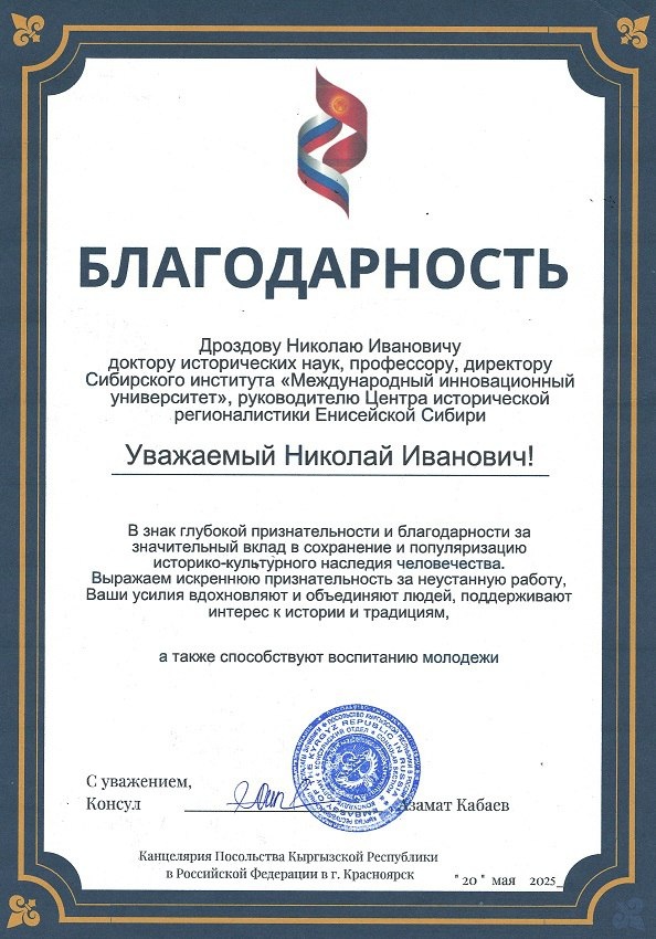20 мая 2025 года доктору исторических наук, профессору Международного инновационного университета Дроздову Николаю Ивановичу Консулом Кыргызской Республики в Российской Федерации Азаматом Кабаевым вручена благодарность за значительный вклад в сохранении и популяризацию историко-культурного наследия человечества.