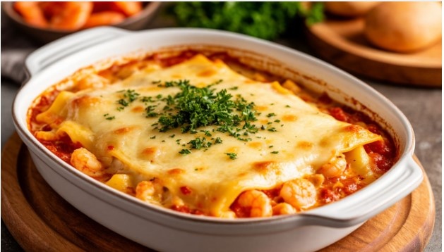 Креветки, мидии и рыба, запеченные в сливочном соусе, и лазанья составляют легкое и изысканное угощение.
