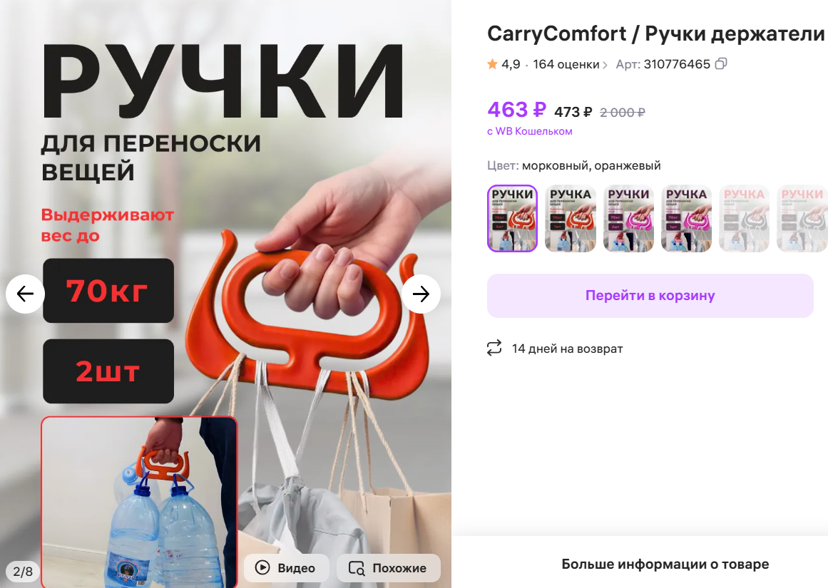 Выдерживают до 70 кг. Плотный пластик. Размеры - 17 на 9,5 см. В комплекте 2 шт. Подойдет курьерам, строителям, молярам и тем, кто много носит покупок с ВБ от ПВЗ до дома)).