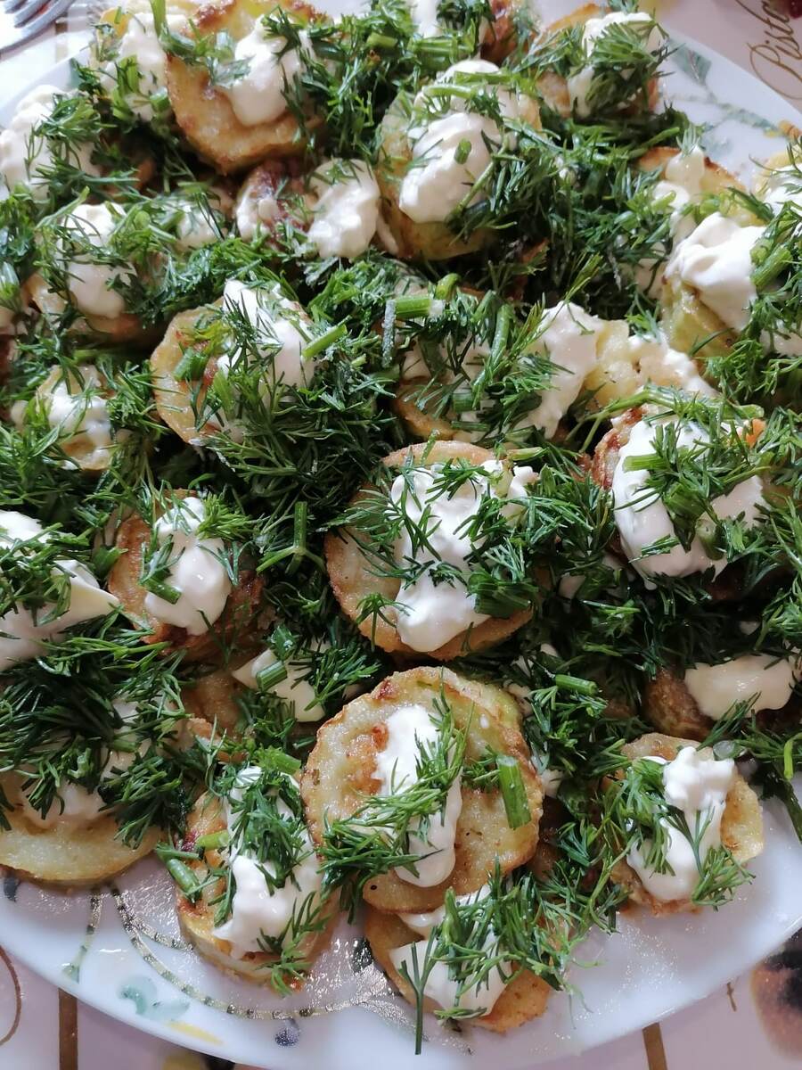 - Выложите кабачки на плоскую тарелку, смажьте чесночные соусом и присыпьте рубленым укропом. Подавайте горячими или остывшими.