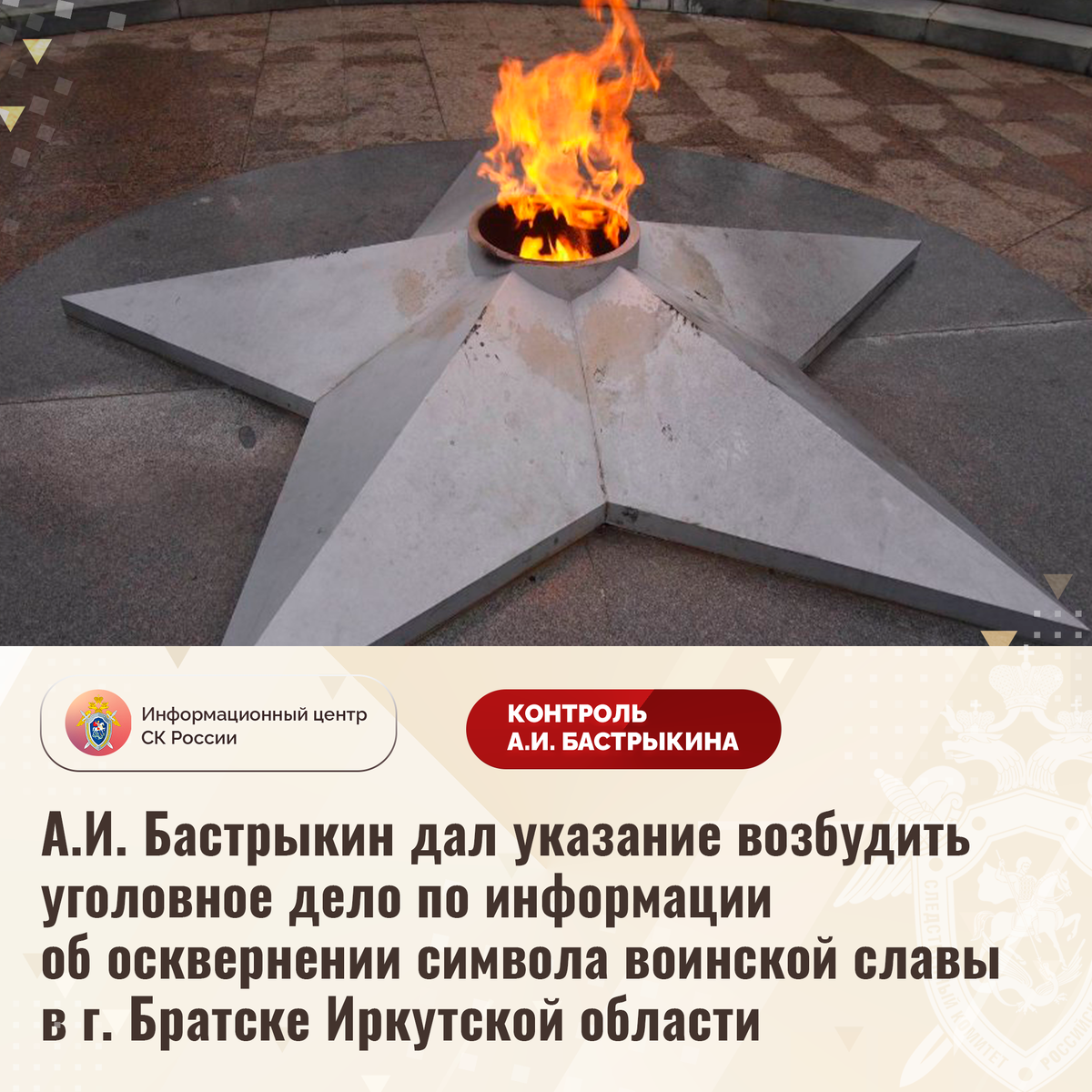 А.И. Бастрыкин дал указание возбудить уголовное дело по информации об осквернении символа воинской славы в г. Братске Иркутской области В сети Интернет сообщается о том, что 1 июня 2025 группа подростков совершила действия, направленные на осквернение символа воинской славы России - Вечного Огня, установленного на Мемориале Славы в городе Братске Иркутской области. В СУ СК России по Иркутской области по данному факту организована процессуальная проверка. Председатель Следственного комитета Российской Федерации Александр Иванович Бастрыкин дал указание руководителю СУ СК России по Иркутской области Анатолию Викторовичу Ситникову возбудить уголовное дело и представить доклад об установленных в ходе первоначальных следственных действий обстоятельствах, а по завершении расследования – о его результатах. Исполнение поручения поставлено на контроль в центральном аппарате ведомства. #СледственныйКомитет #СКРоссии #СКР #ИЦСКР #ИнформационныйЦентр #АлександрБастрыкин #ПредседательСКР #КонтрольП