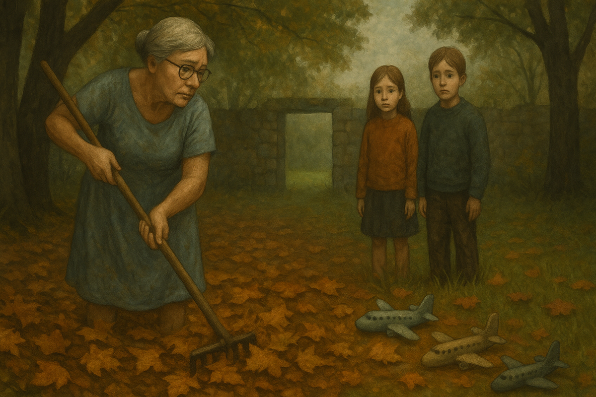 За женщиной наблюдали находящиеся неподалеку девочка и мальчик. Они стояли неподвижно, словно боясь помешать ей, и провожали ее растерянными взглядами. Рядом с ними на траве лежали три маленьких самолетика, с которых давно сошла краска.