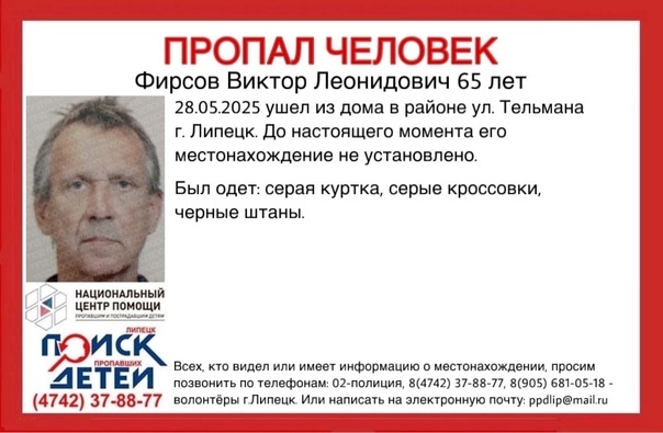 В Липецке волонтеры и полиция ищут пропавшего 65-летнего Виктора Фирсова. Об этом сообщили в ЛООО «Поиск пропавших детей». Мужчина ушел из дома в районе улицы Тельмана 28 мая, но так и не вернулся назад. Его местонахождение до сих пор не установлено. Особых примет в ориентировке не указано, однако известно, что на пропавшем была серая куртка, черные штаны. Мужчина был обут в серые кроссовки. Волонтеры отмечают, что репост или реакция на публикацию о пропавшем может помочь в поиске. Если вы узнали мужчину и знаете что-нибудь о его местонахождении, звоните по телефонам: 02 — полиция, 8 (4742) 37-88-77, 8 (905) 681-05-18 — волонтеры.