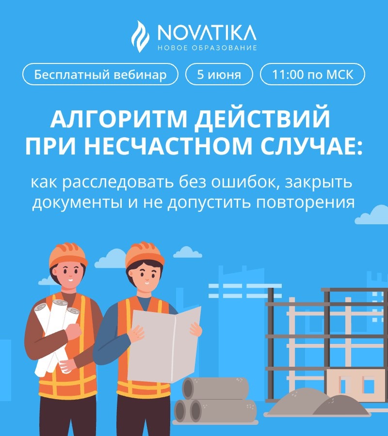 🚨 Уже завтра — бесплатный вебинар: «Алгоритм действий при несчастном случае: как расследовать без ошибок, закрывать документы и не допустить повторения»! 📅 5 июня в 11:00 (МСК) Успейте зарегистрироваться и получите четкий алгоритм действий: как провести расследование НС без ошибок, корректно закрыть документы и внедрить меры профилактики.. 📌 Разберём: — действия при несчастном случае — организации, которые необходимо уведомить о несчастном случае — классификация несчастных случаев — какие документы оформляются в ходе расследования несчастного случая — расследование несчастных случаев с подрядчиком 🎁 Всем участникам — набор памяток по расследованию НС. 👥 Кому будет полезно: руководителям, специалистам по ОТ, ответственным за обучение, а также тем, кто следит за изменениями в сфере охраны труда. Успейте зарегистрироваться по ссылке! 👉 https://clck.ru/3MSTnU